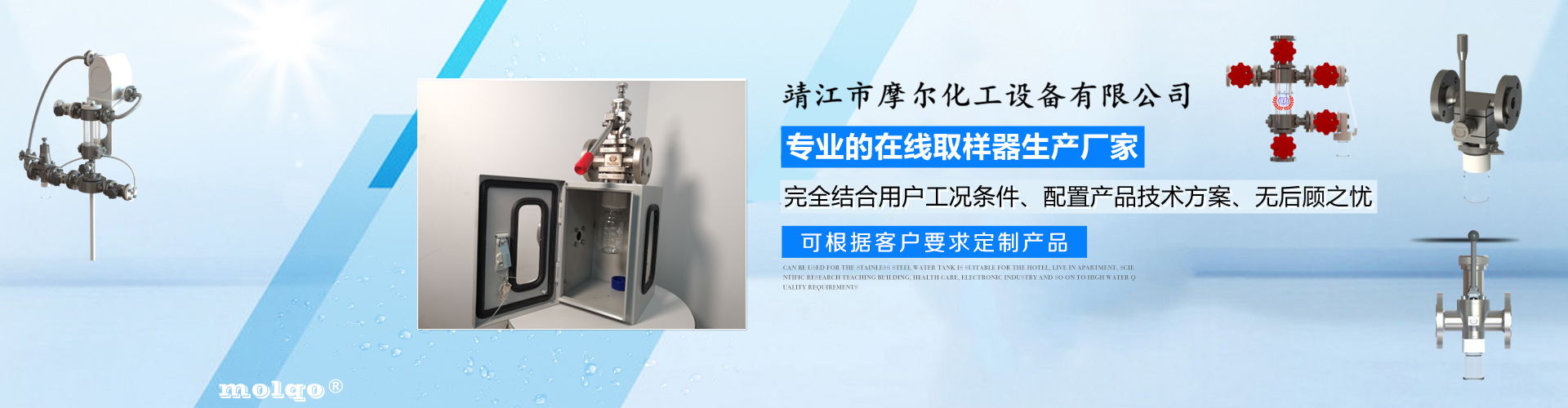 靖江市摩爾化工設備有限公司位于蘇中明珠——江蘇省靖江市城南工業園區東進路北側天元艾爾瑞內,另有生產基地位于靖江市經濟技術開發區新號路1號鼎電科技園內。我公司由數名長期從事化工生產、氟塑襯里模具開發以及機械自控設備的專業人員共同合作成立,致力于提供客戶最優的高效在線取樣、反應及精餾分離設備,為客戶提供合理的設備選型方案,以幫助客戶提高綜合生產效率以及改善生產現場環境為目標。 本公司主要制造及銷售的產品有:釜用在線取樣裝置,管道取樣閥,釜用清洗噴淋裝置、搪玻璃設備、GMP專用搪玻璃設備、氟塑襯里設備、攪拌器、釜用機械密封、氣動閥門及搪玻璃管道、襯氟閥門管道、非標不銹鋼容器,精餾塔塔器、片式冷凝器及PTFE密封件、鋯、鈦、鉭、鎳等加工件制品。我司是一家集研發銷售、設計咨詢服務于一體的專業···